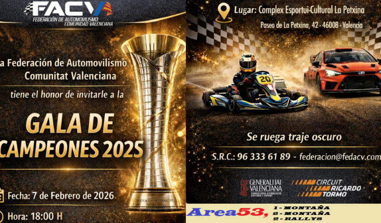 La Gala de Campeones de la Federación de Automovilismo de la Comunidad Valenciana, está prevista para el próximo 7 de febrero a las 18.00 horas en el complejo deportivo de la Petxina (Valencia)